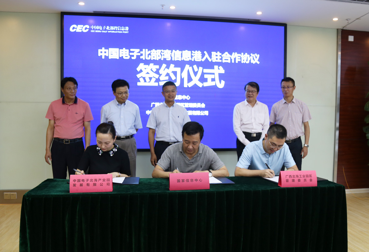 國家信息中心、北海工業(yè)園區(qū)管委會、中國電子北海產(chǎn)業(yè)園公司簽訂戰(zhàn)略合作協(xié)議(馬忠玉、郭彥江、白冰簽約;北海市委常委、副市長陳新,中國科學(xué)院院士、北京大數(shù)據(jù)研究院院長鄂維南,中國信息協(xié)會副會長朱玉,北京正宏置業(yè)集團有限公司董事長徐俊男,國家信息中心信息與網(wǎng)絡(luò)安全部副主任祿凱共同見證簽約儀式)